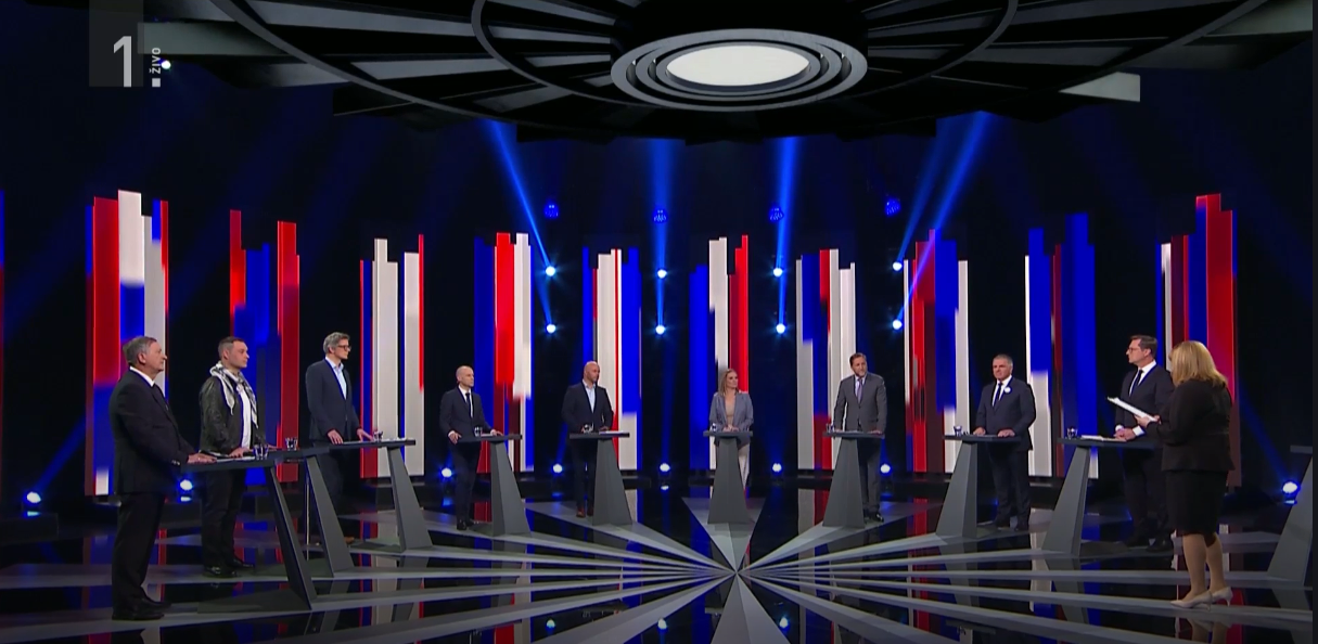 Na predvolilnem soočenju na TV Slovenija so kandidati iz parlamentarnih strank med drugim odgovarjali na vprašanja o gospodarstvu, davkih in energetski draginji. Foto: RTV 365 – posnetek zaslona